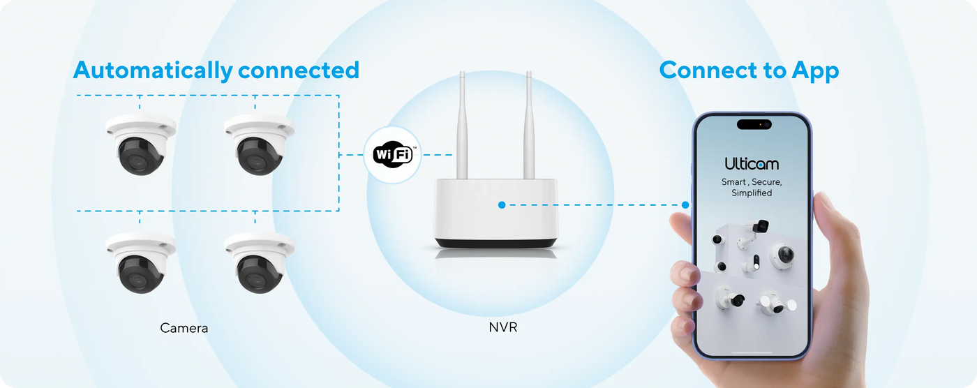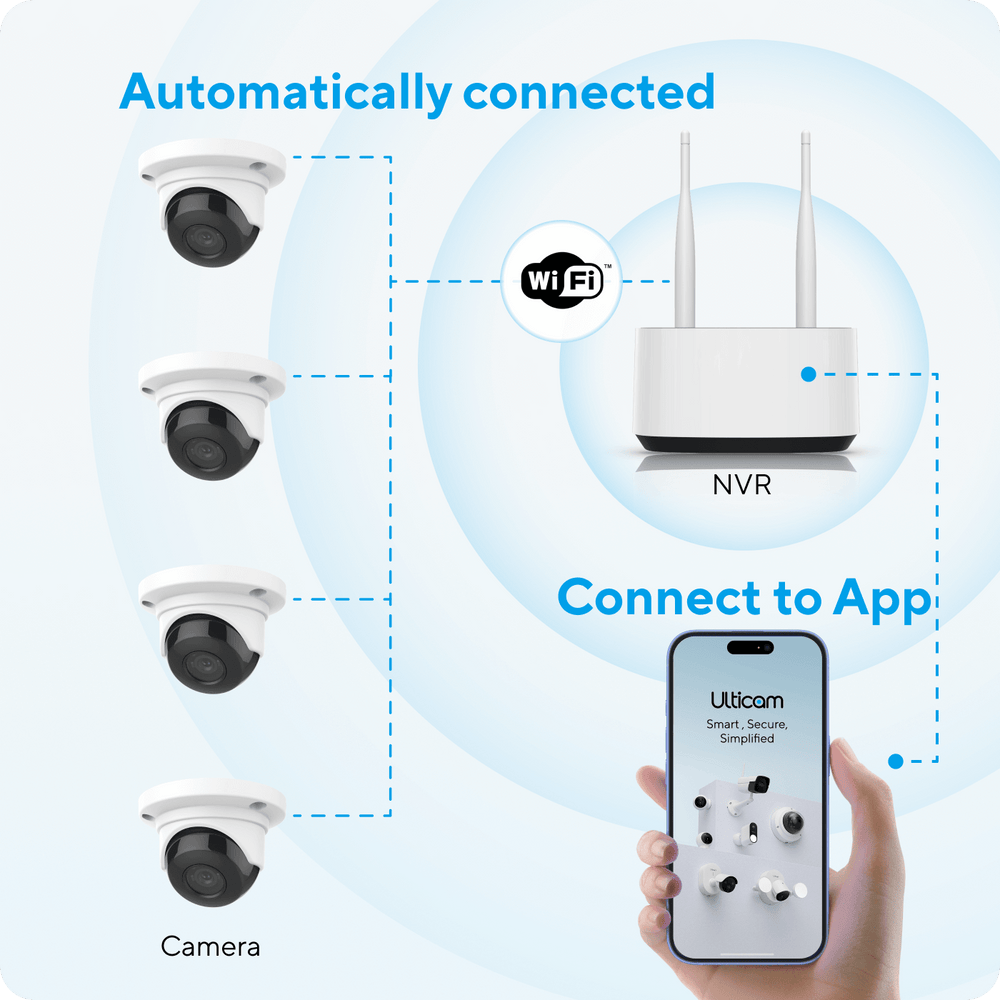 The Ulticam Wi-Fi Bundle combines a Mini NVR with four indoor or outdoor dome cameras, delivering security through seamless WIFI connectivity. This intelligent surveillance system eliminates complex wiring whilst providing robust local recording and mobile management capabilities.